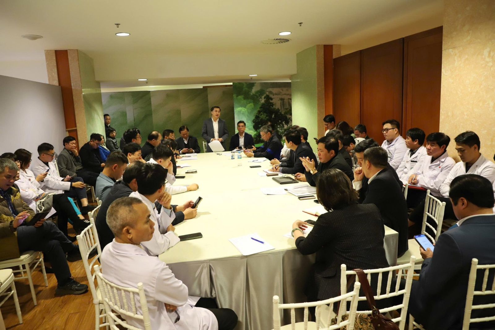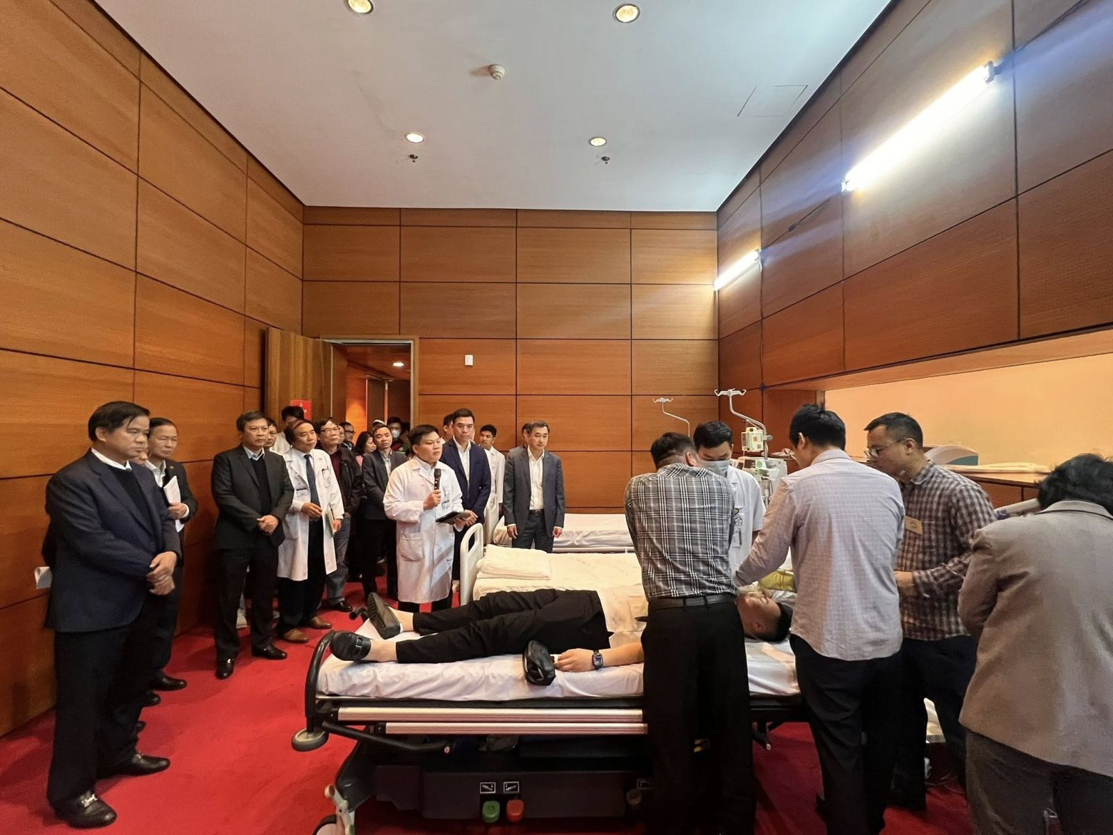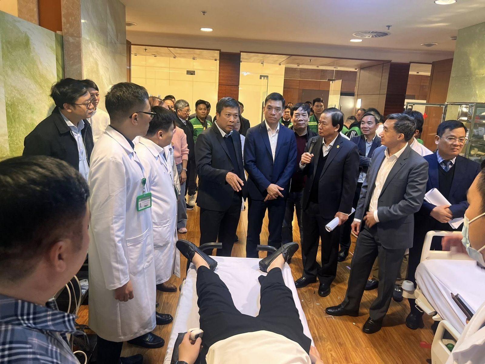 Tham dự buổi diễn tập còn có TS. Hà Anh Đức - Cục trưởng Cục Quản lý Khám, chữa bệnh- Phó Chủ tịch Hội đồng Y khoa Quốc gia- Chủ tịch Hội đồng Chuyên môn về công tác khám, chữa bệnh phục vụ Đại hội; TS Hoàng Minh Đức- Cục trưởng Cục Phòng bệnh; TS Nguyễn Minh Hằng- Phó Cục trưởng Cục An toàn Thực phẩm; GS.TS. Nguyễn Lân Việt - Phó Chủ tịch thường trực Hội đồng chuyên môn về khám bệnh, chữa bệnh phục vụ Đại hội đại biểu toàn quốc lần thứ XIV của Đảng: Chủ trì về chuyên môn buổi diễn tập; GS.TS. Nguyễn Gia Bình - Ủy viên Hội đồng Chuyên môn Bảo vệ sức khỏe cán bộ miền Bắc, Chủ tich Hội Hồi sức cấp cứu và Chống độc Việt Nam; PGS.TS. Đào Xuân Cơ, Ủy viên Hội đồng Chuyên môn Bảo vệ sức khỏe cán bộ miền Bắc, Giám đốc Bệnh viện Bạch Mai; PGS.TS. Nguyễn Thế Anh - Phó Chủ tịch Hội đồng Chuyên môn Bảo vệ sức khỏe cán bộ miền Bắc, Giám đốc Bệnh viện Hữu Nghị; PGS.TS. Phạm Thái Giang - Ủy viên Hội đồng Chuyên môn Bảo vệ sức khỏe cán bộ miền Bắc, Phó Giám đốc Bệnh viện Trung ương Quân đội 108; PGS.TS Trần Đình Thơ – Phó Giám đốc Bệnh viện Hữu Nghị Việt Đức.